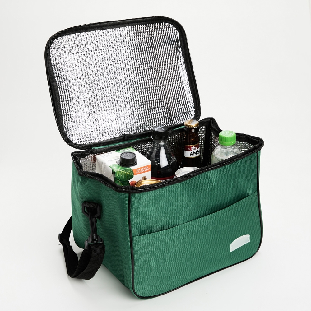 Bolsa térmica feita em Oxford resistente à água, com fechamento em zíper e capacidade de até 13 litros. Possui revestimento térmico em folha de alumínio, bolso frontal externo e duas alças: uma fixa localizada na tampa e outra transversal removível.