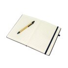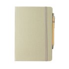 Caderneta ecológica com capa em fibra da palha de arroz. Contém aproximadamente 80 folhas amareladas com pauta, além de duas folhas de guarda, uma fita elástica para fechamento e porta-canetas em elástico. Acompanha uma caneta esferográfica de carga azul de 1,0mm com corpo em papelão e clip, acionamento por clique e ponteira em plástico.