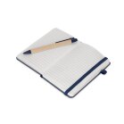 Caderneta ecológica de capa dura revestida em fibra de palha de trigo. Contém aproximadamente 80 folhas brancas com pauta, além de duas folhas de guarda, uma fita para fechamento e porta-canetas elástico. Acompanha uma caneta esferográfica de carga azul de 1,0mm com corpo em papelão e clip, acionamento por clique e ponteira em plástico.