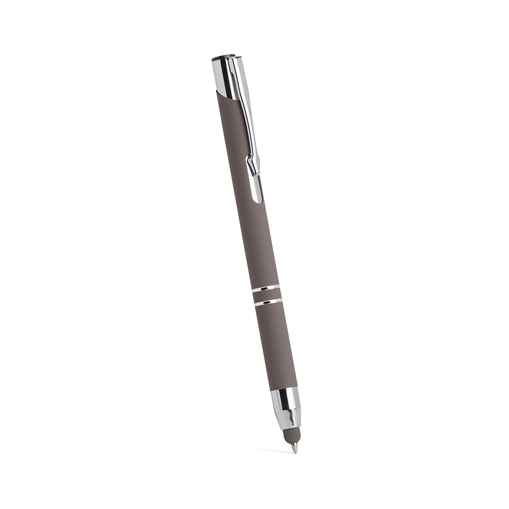 Caneta esferográfica com carga azul de 1.0mm e acionamento por clique. De construção metálica, também possui ponteira emborrachada que permite seu uso como uma caneta touch para interação com dispositivos de tela sensível ao toque.