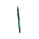 Caneta metálica com textura próximo à ponta, detalhes em plástico e acabamento emborrachado no topo para o uso em dispositivos com telas sensíveis ao toque. Conta ainda com acionamento por clique e carga esferográfica azul de 1,0mm.