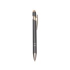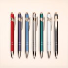 Caneta metálica com detalhe emborrachado no topo, ideal para interação com dispositivos de telas sensíveis ao toque. Possui acionamento por clique e carga esferográfica azul de 1,0mm.
