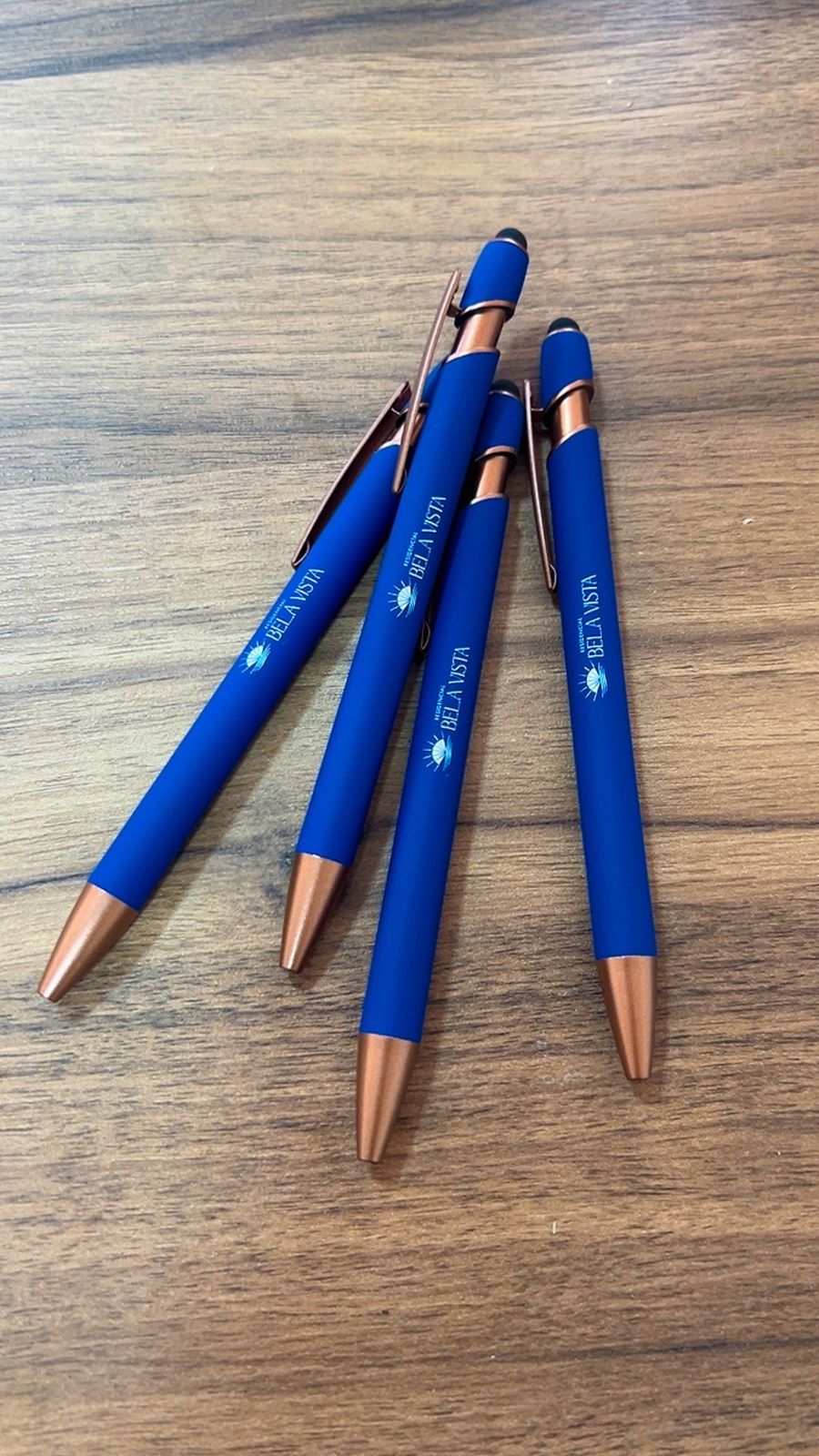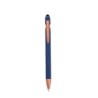 Caneta metálica com pintura de acabamento emborrachado e acionamento por clique. Conta com topo emborrachado para uso em dispositivos com telas sensíveis ao toque, além de carga esferográfica azul de 1,0 mm.