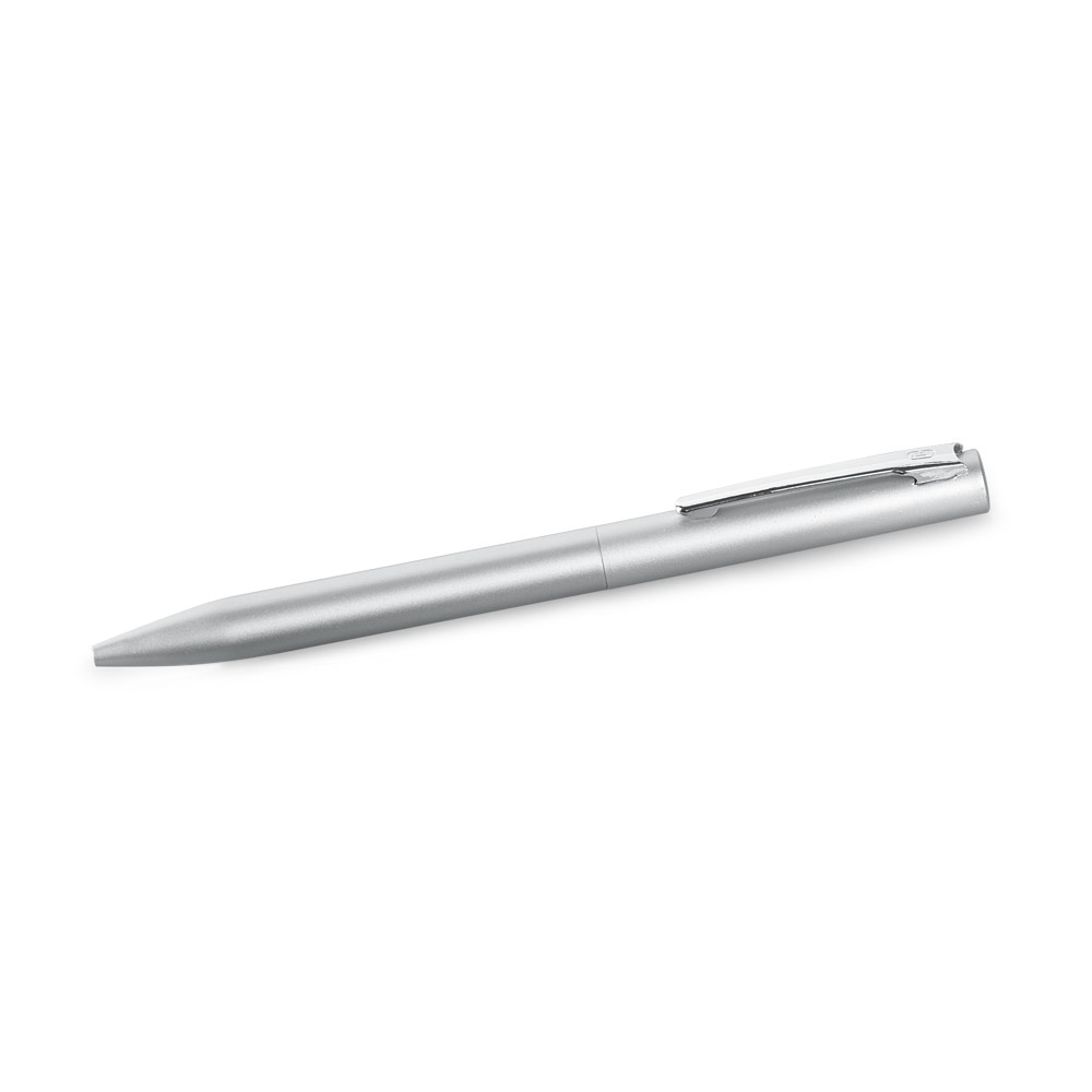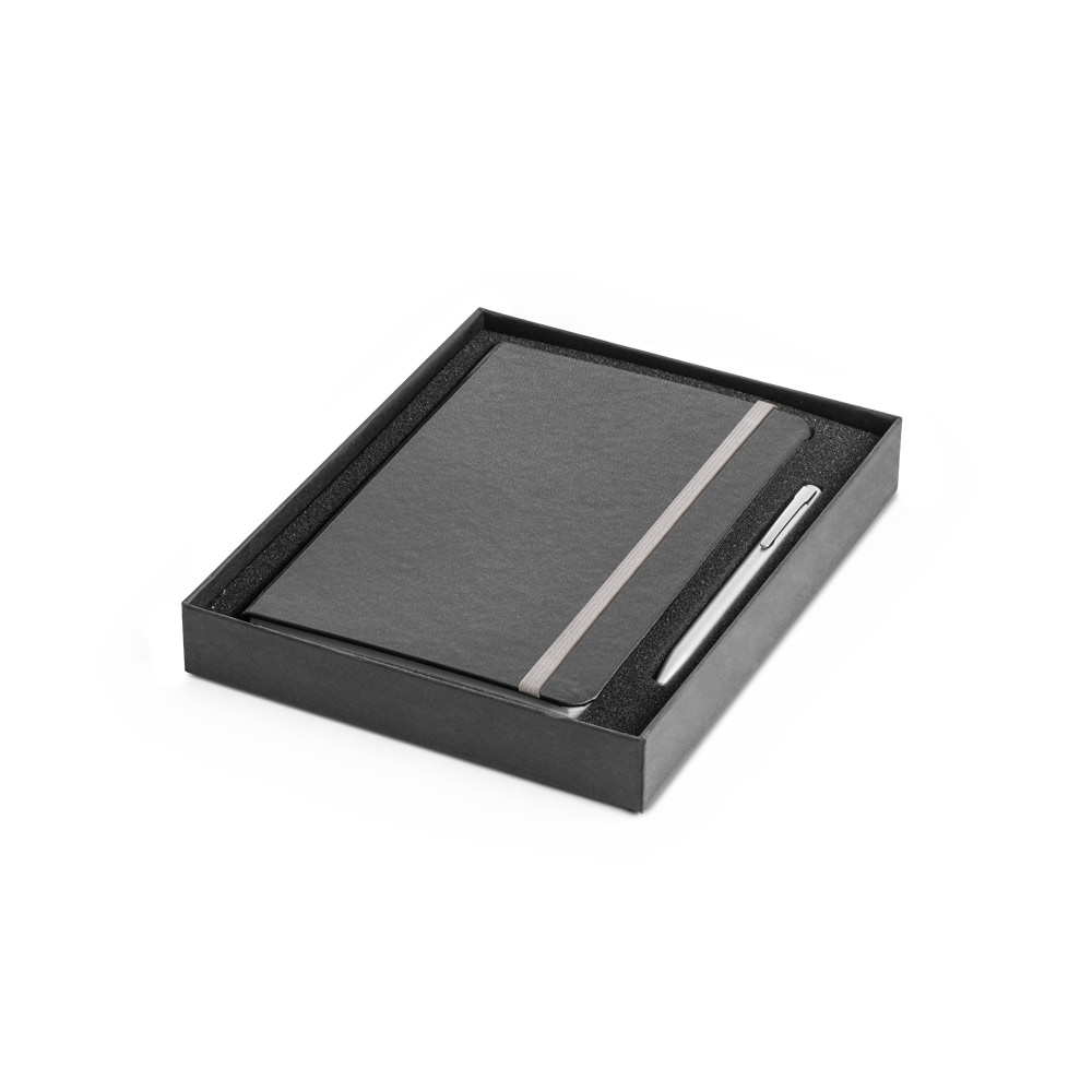 Conjunto esferográfica e caderno A5. O caderno A5 de capa dura tem 160 páginas pautadas cor marfim, fita separadora, bolso interior e elástico para fecho do bloco. A esferográfica em alumínio e clipe de ferro, tem mecanismo twist e escrita em azul. Conjunto fornecido em caixa de oferta. Esferográfica: ø10 x 138 mm | Caderno: 137 x 210 mm | Caixa: 190 x 240 x 30 mm