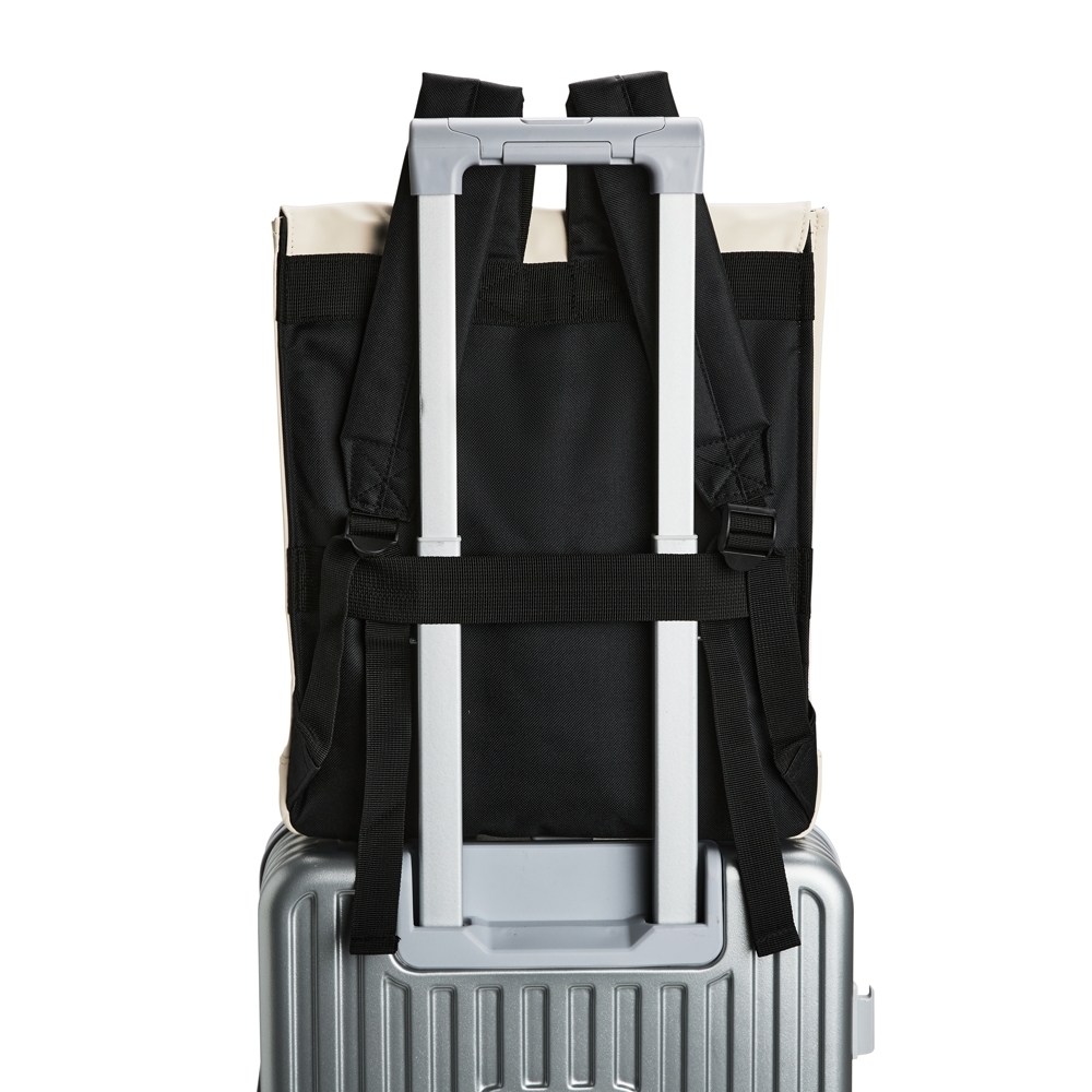 Mochila em couro sintético impermeável com capacidade de até 13 litros. Apresenta compartimento interno com bolso para notebooks de até 13 polegadas. Possui duas alças para as costas, alça de mão e engate posterior para mala de viagem.